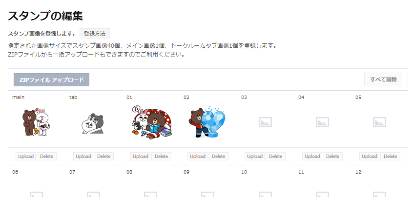 2. 「スタンプ画像」ページ下部の「編集」より、スタンプの画像データをアップロード