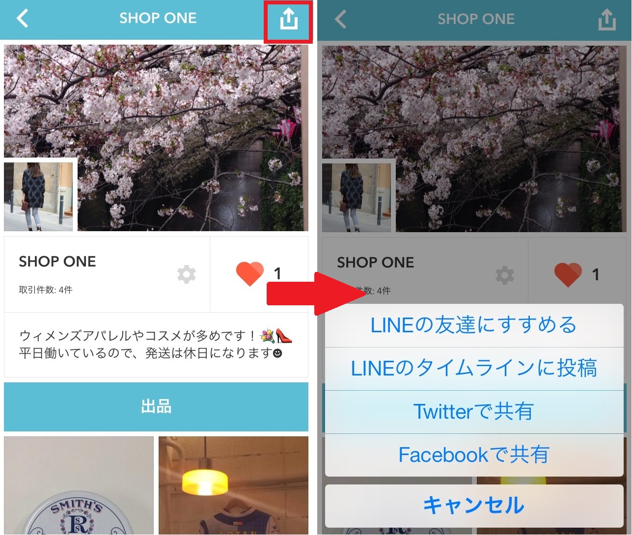 ショップページ/商品詳細ページの右上にある共有マークをタップすると、LINEのトーク、タイムライン、Twitter、Facebookにシェアできます。