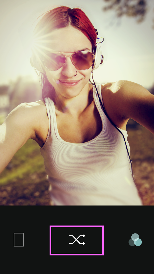 写真撮影画面で”ランダム”マークをタップすると、ランダムでフィルターが変わります。さらに、画面をスワイプするだけでもフィルターの変更ができるので、気に入ったフィルターを片手で簡単に見つけることができます。