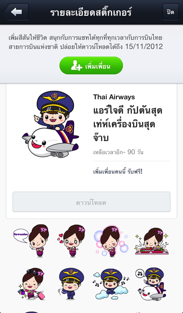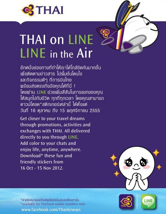 LINE公式アカウントでは、タイ航空の利用や現地滞在が楽しく便利になる情報の配信をすると共に、アカウントを友だちに登録した人限定で無料ダウンロードができるタイ航空オリジナルキャラクターのスタンプを11/15まで期間限定提供しています。