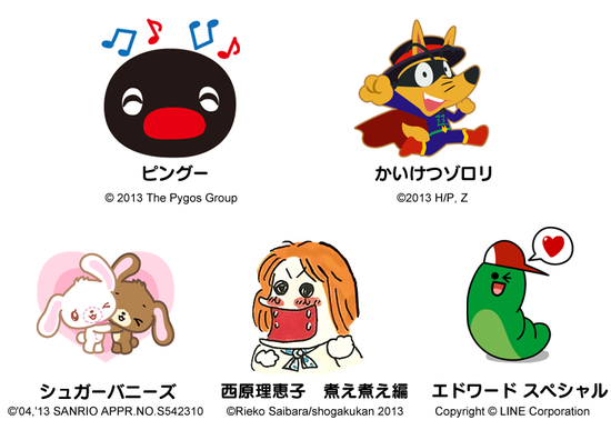 スタンプ 2013年09月26日 ピングー、かいけつゾロリ、シュガーバニーズ、西原理恵子、芋虫のLINEキャラ・エドワード 全5種類のスタンプが登場! LINEのスタンプショップに新しいスタンプが5種類(各170円)加わりました!