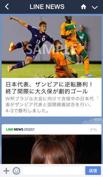 LINE NEWS 2014年06月11日 W杯の速報もLINEで届く!「LINE NEWS」アプリ&公式アカウントでW杯関連ニュースのまとめ記事や続報をチェックしよう! LINE公式ニュースアプリ「LINE NEWS」では、サッカーW杯に関する速報配信や特集ページ掲載などを実施します!この時期、サッカー日本代表選手の情報や試合結果などたくさんのニュースが出るので、 「どこを見たらいいのかが分からない!」「リアルタイムで中継を見ていられ