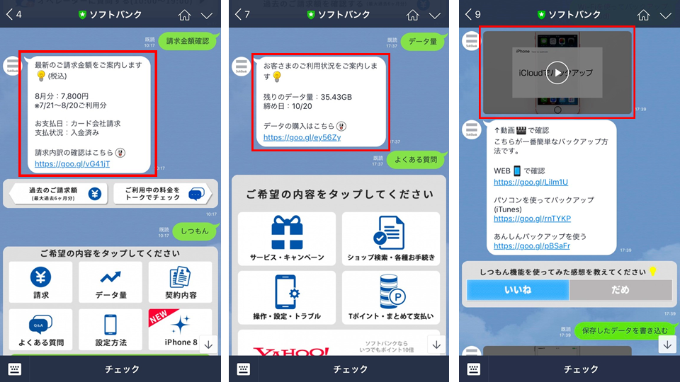 2017年10月19日 【LINEの便利ワザ】SoftBankユーザーの方必見☆LINEで利用状況をチェック! 今月の携帯料金いくらだろう?動画観すぎちゃったかな、残っているデータ量が気になる・・。そんなSoftBankユーザーの方必見!「SoftBank」の公式アカウントと友だちになると、トーク上で質問ができたりご利用状況を確認できます☆操作方法も動画で教えてくれますよ♪SoftBan
