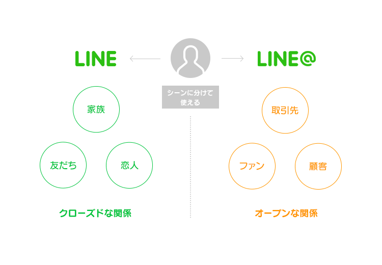 普段お使いのLINEが家族や身近な友だち・知り合いとの利用を前提にしているのに対し、LINE@は、顧客やファン、仕事上つながりがある人々への情報発信や連絡をするためのサービスです。メッセージの送信には“LINE@”専用アプリを使用するため、普段使っているLINEと友だちリストやトークリストが混ざることはありません。
