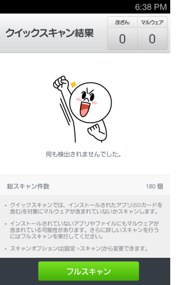 クイックスキャンでは数秒でアプリの調査(スキャン)が完了するので、新しいアプリをインストールした時など手軽に利用することができます。さらに詳しく調査をしたい場合は「フルスキャン」の実行も可能です。