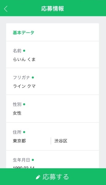 名前や性別、居住地、店舗からの質問に答えたら、[応募する]をタップして完了!