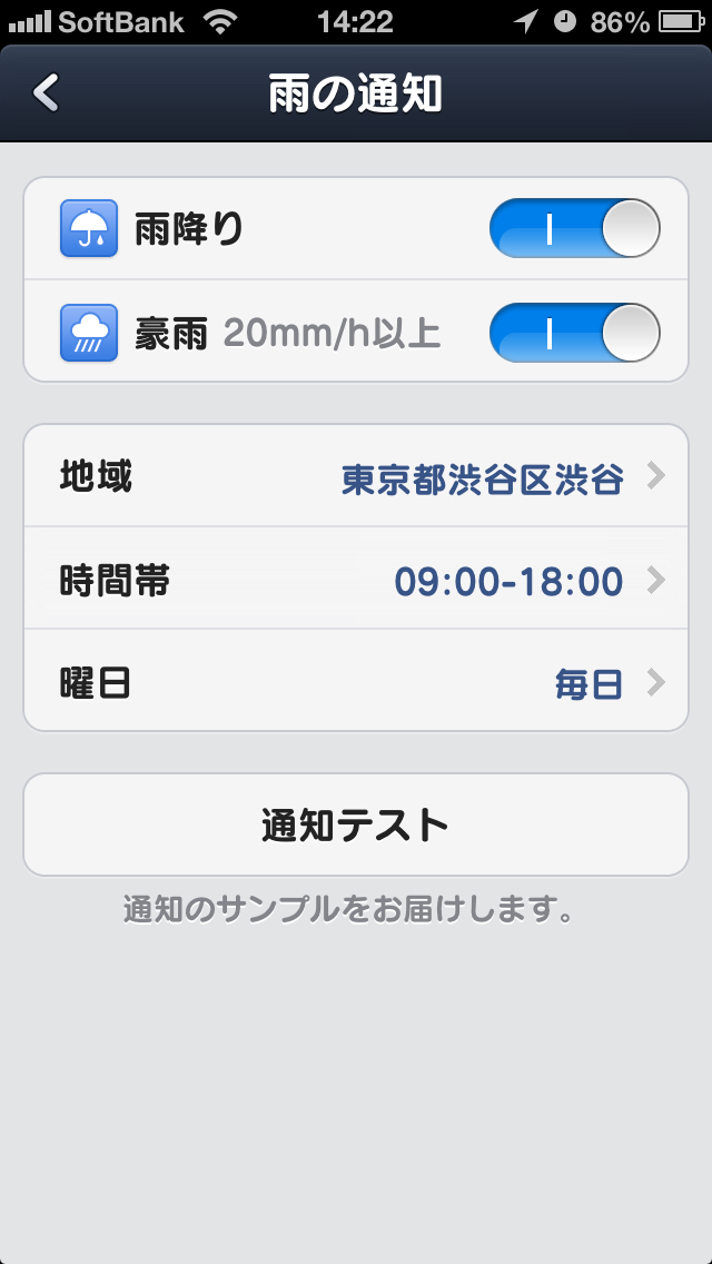 雨の通知・・・「雨降り」また「豪雨」のどちらかが発生した際に通知させることができ、地域・時間帯・曜日が指定できます。
