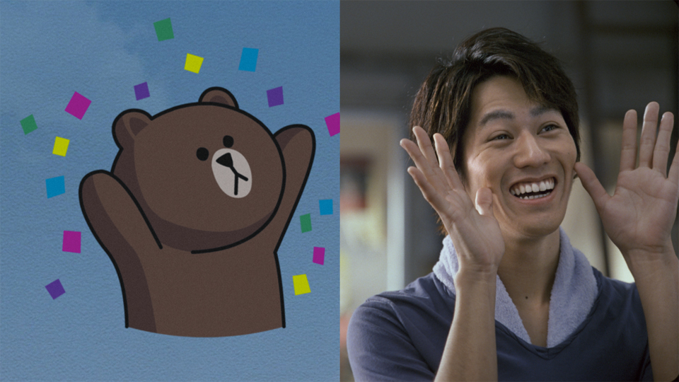 「LINE 劇団 表情練習(スタンプ)篇」の最後のシーンでは、石原さんが演じるムーンの他にも、今回、永山さん演じる熊のブラウン、木南さん演じるうさぎのコニー、そして及川さん演じる金髪キャラのジェームズが登場。