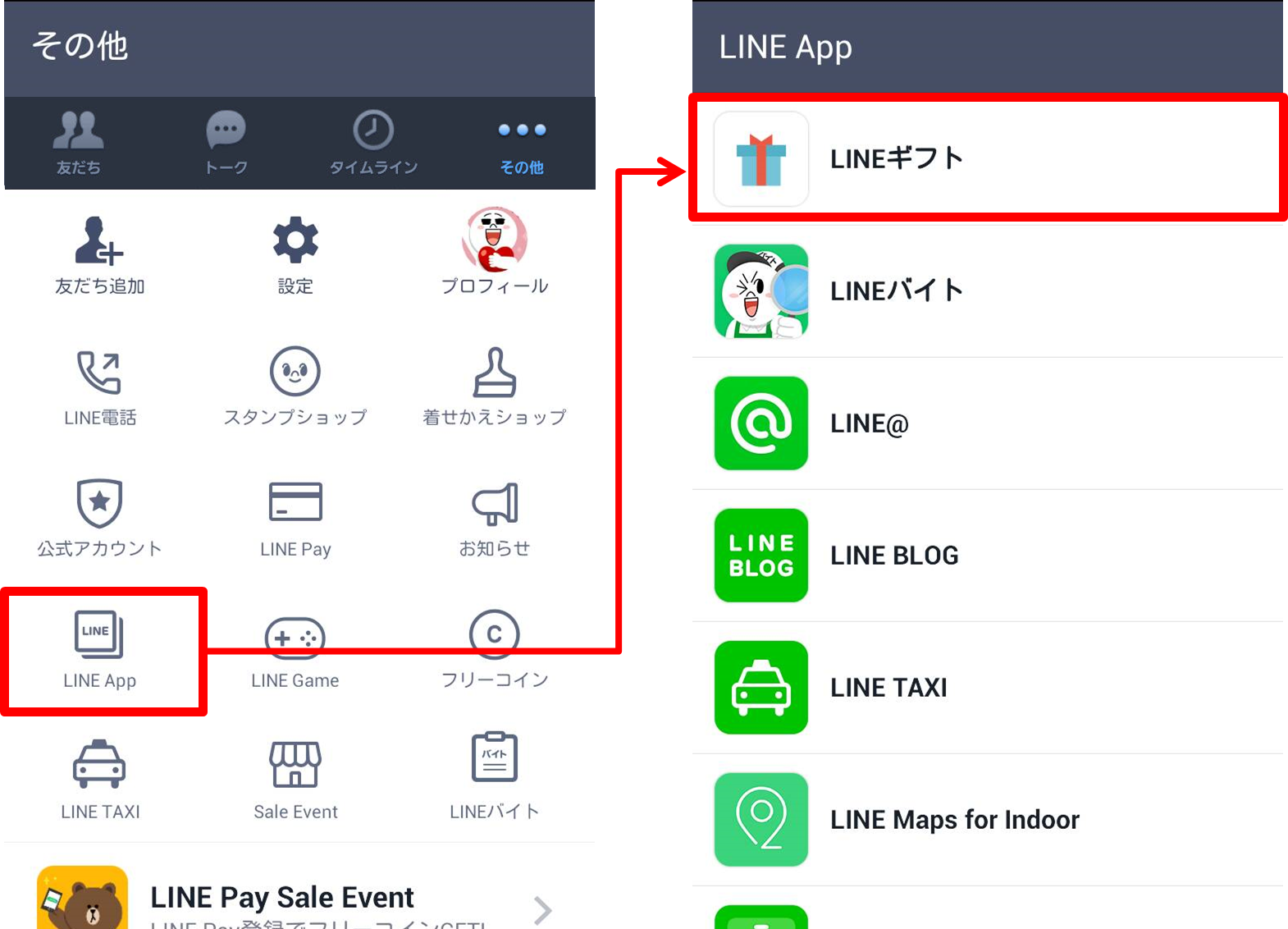 1) LINEアプリの「その他」→「LINE Apps」から「LINE ギフト」を開く