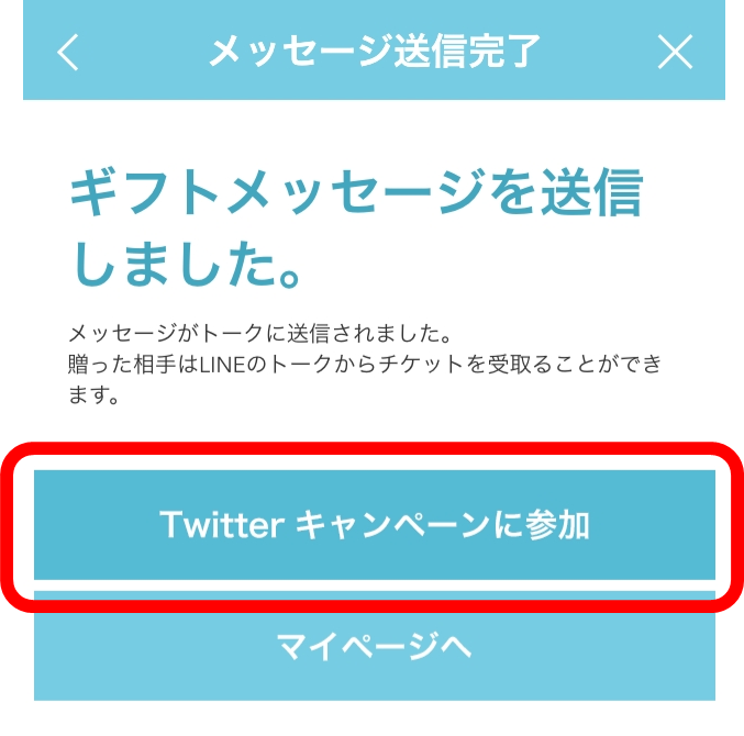 無料キャンペーン対象商品を贈った後のメッセージ送信完了画面にある「Twitterキャンペーン」をタップ。