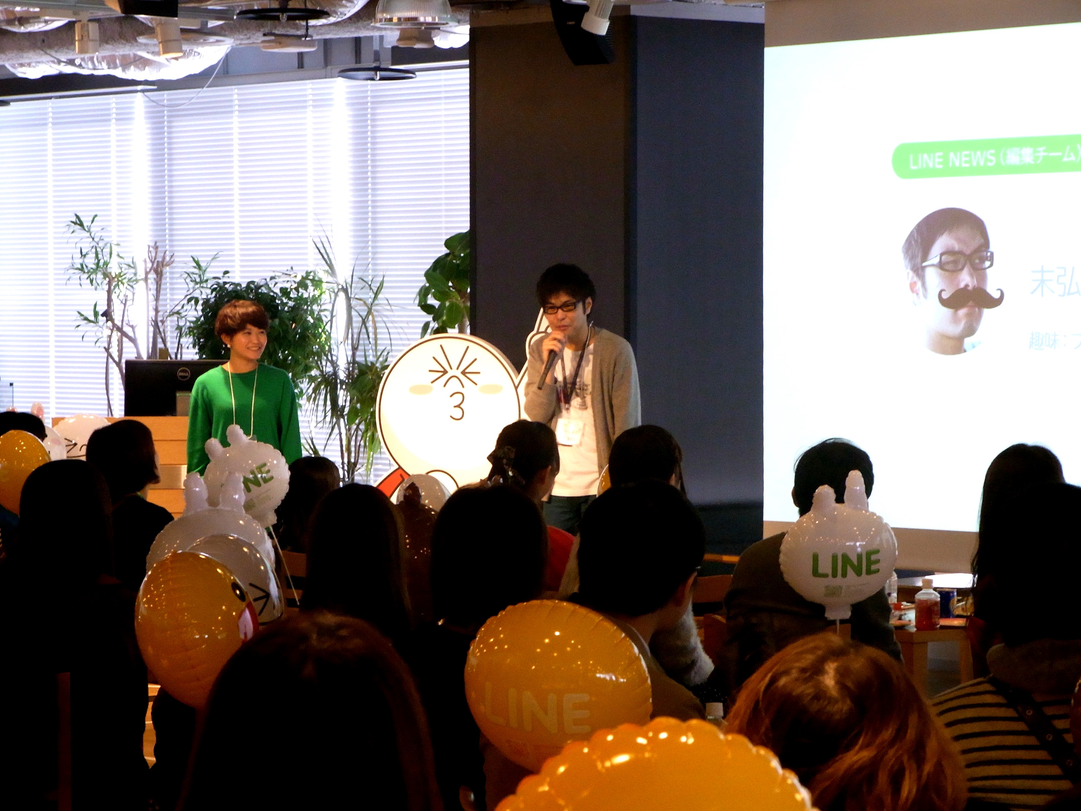 会場はLINE株式会社の社内にあるカフェスペース。LINEキャラクターたちの大きなぬいぐるみやパネル、風船などが皆さんを歓迎しました。