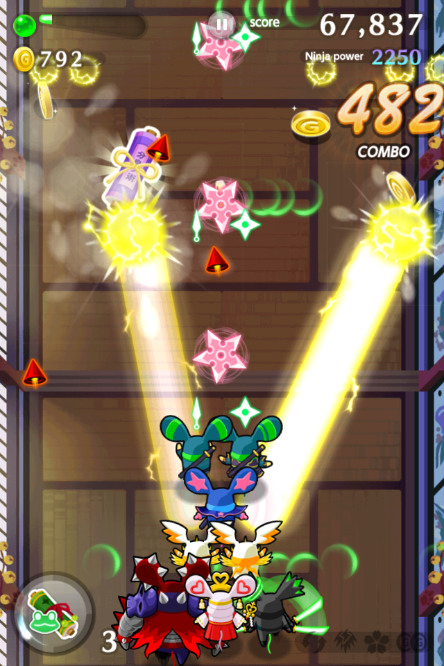 捕まった味方を救出すると、味方が攻撃に加わってパワーアップ!敵忍者や障害物にぶつかったらゲームオーバーです。