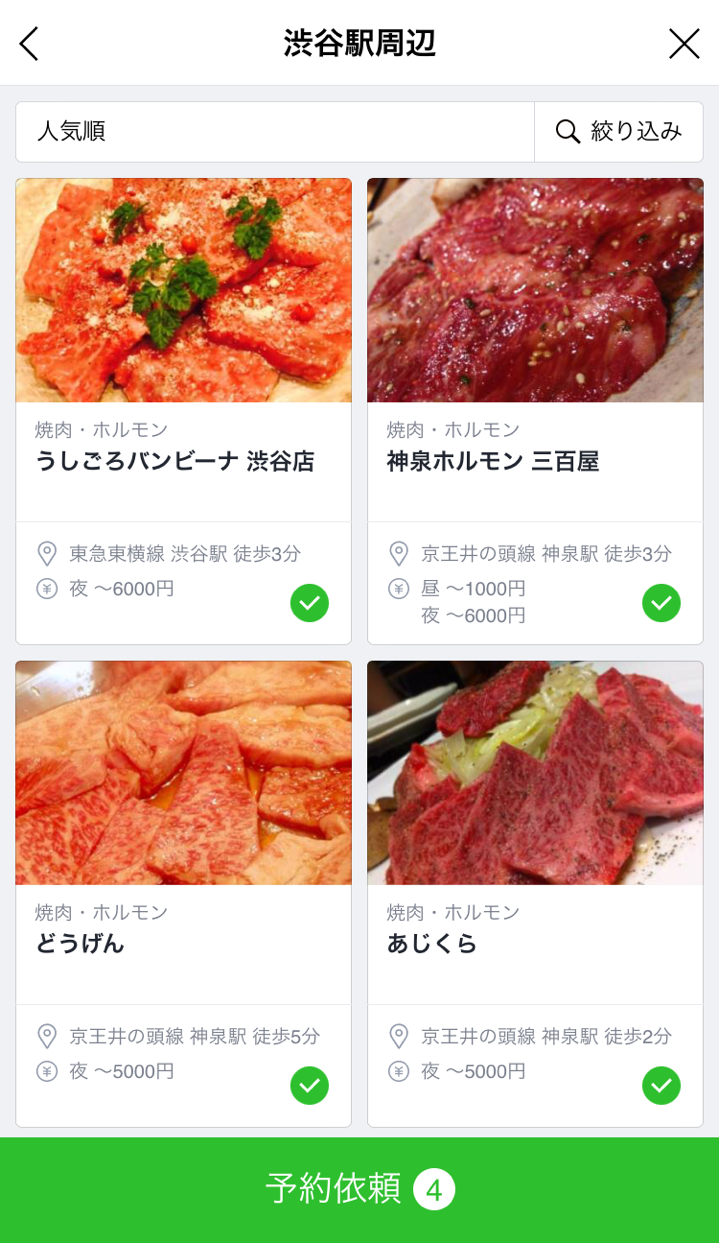 今回、narumiさんは、「渋谷駅周辺」の「焼肉・ホルモン」をチョイス。人気順の上位4店を予約依頼していました。
