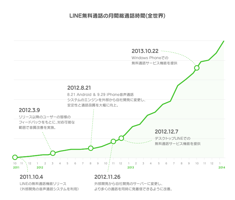 特に、自社開発の音声通話システムに完全に切り替えた2012年11月から直近の2014年1月までには、以下のような変化がみられました。(LINE株式会社 指標)
