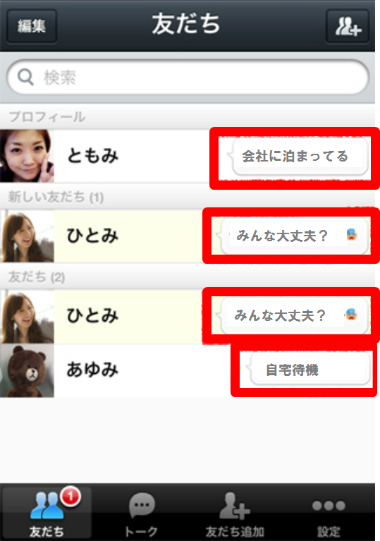 そのため、LINEで友だちになっている人全員に自分の「ステータスメッセージ」を見てもらうことができるので、緊急時に今の自分の状況をみんなに知らせることができます。