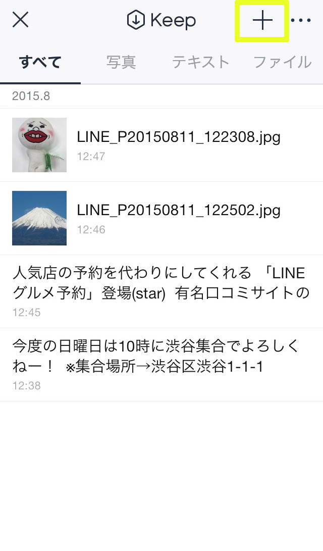 LINEのプロフィール画面、または[その他]>[LINE Apps]からKeepを開き、画面右上の+マークをタップしてください。