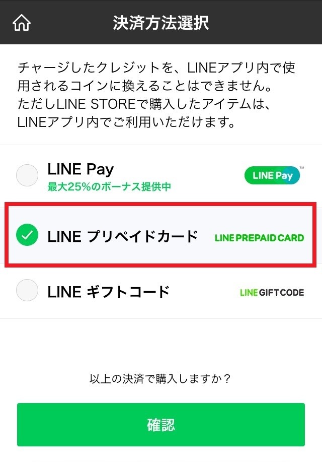 4.[決済方法選択]のページで「LINE プリペイドカード」を選択し、PINコードを入力して該当金額をLINE クレジットにチャージする。
