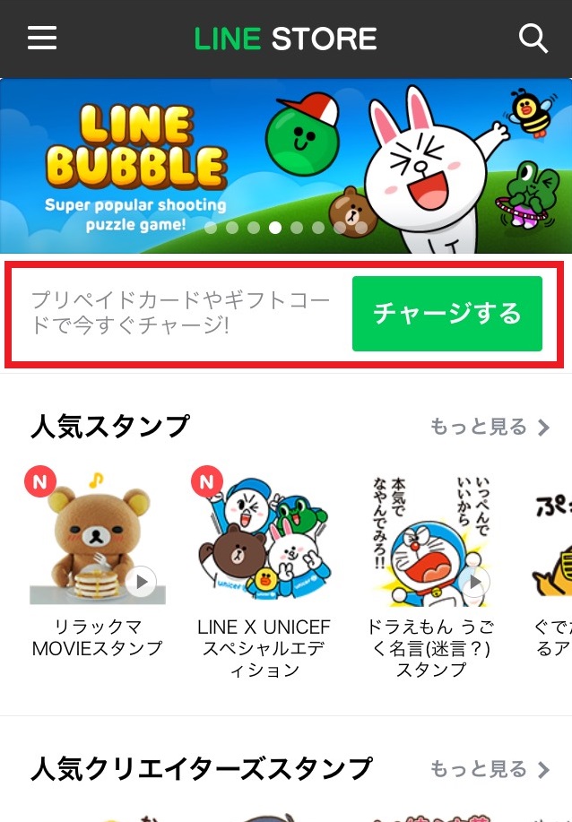 リニューアルでは、TOPページに[チャージする]ボタンを配置し、現在たくさんの方にご利用いただいている「LINE プリペイドカード」や「ギフトコード」を手際よくチャージできるようになりました。