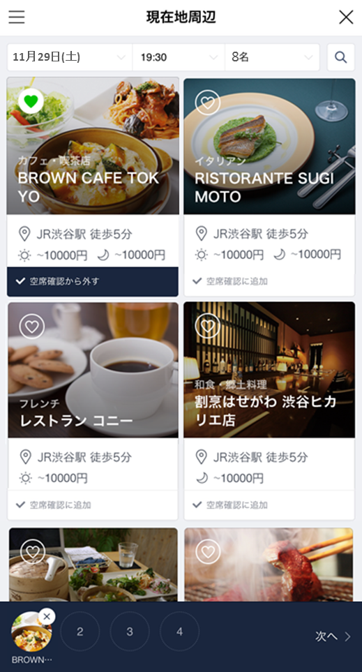 8) 選択した日程、人数で予約が可能な現在地周辺のお店が、人気順で表示されます。あとは、時間を決めて、好みのお店を選んで予約するだけです。