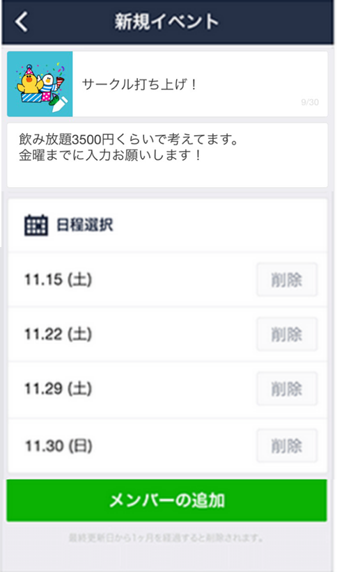 4) 新規イベントのページに、イベント名と内容を記入し、「日程選択」から候補日を選択しましょう。さらに「メンバーの追加」をタップして、招待するメンバーを決めていきます。