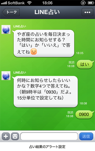 LINE占いからその日の占い結果を受け取る時間をアラート設定することができます。例えば、「0800」と送信すれば、毎朝8時にその日の運勢をチェックできるので、起きる時間や通勤時間に合わせて設定してみるのもオススメです。