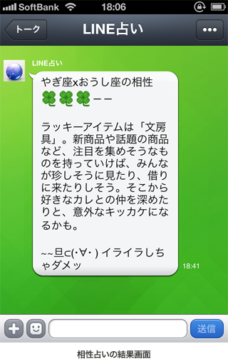 本日、LINEで占いができる公式アカウント「LINE占い」が登場しました!誕生日を教えると、毎日の運勢や相性をLINEのトーク上で答えます。ご利用はもちろん無料です。