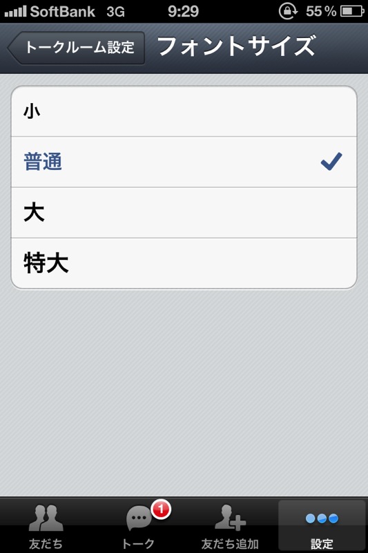 トークの表示文字サイズを「小」「普通」「大」「特大」の4種類から選択できます。一度選択すると、すべてのトーク画面に適用されます。
