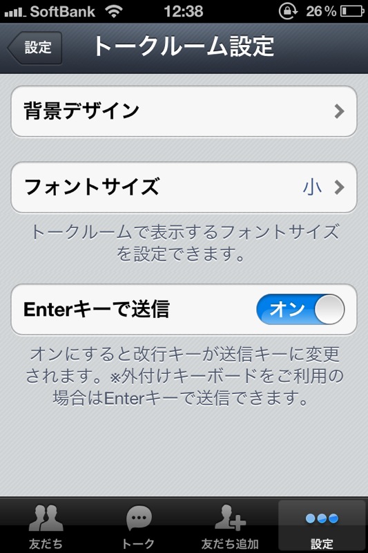 設定方法:「設定」>「トークルーム設定」>「Enterキーで送信」を「オン」