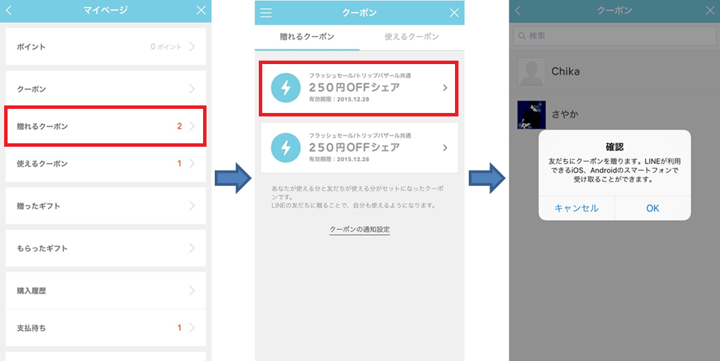 クーポンを贈られた友だちがフラッシュセールと友だちでない場合、「使えるクーポン」をタップすると友だち追加画面に切り替わりますので友だち追加した後ご使用ください。