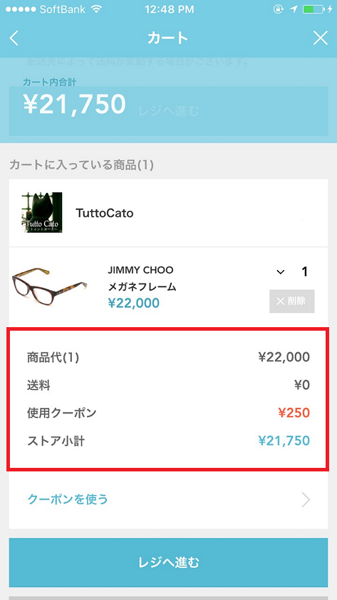 使用したクーポンの金額分が差し引かれた代金で注文確定。