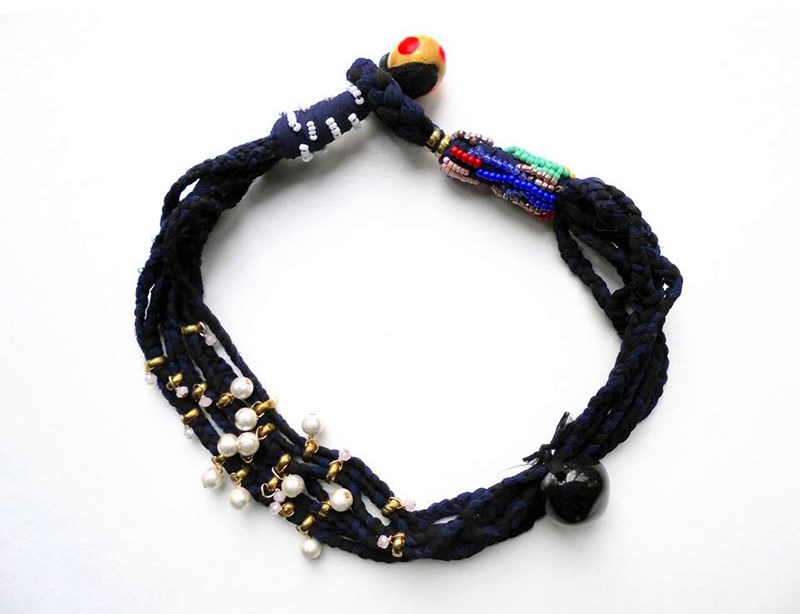 編み込んだシルクを束ね、ビーズや天然石などを散りばめたネックレス