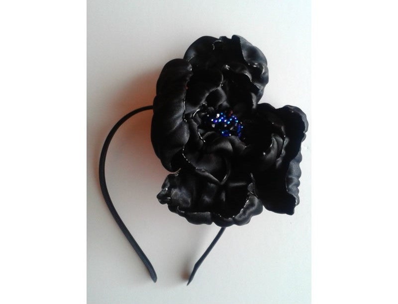 柔らかなサテン生地の花に、黒とビーズを散りばめたヘアアクセサリー