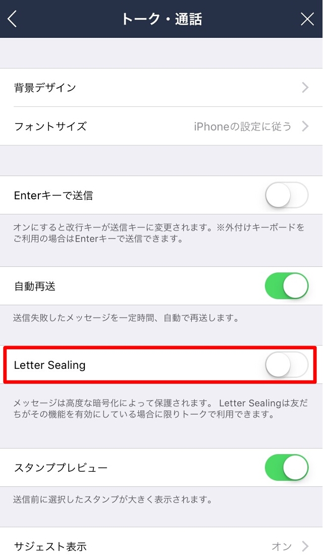 メッセージ保護のためLetter Sealingの設定を常時オンにすることをお奨めしますが、設定を変更したい場合は以下の手順を参照してください。※スマートフォン版LINEで操作してください