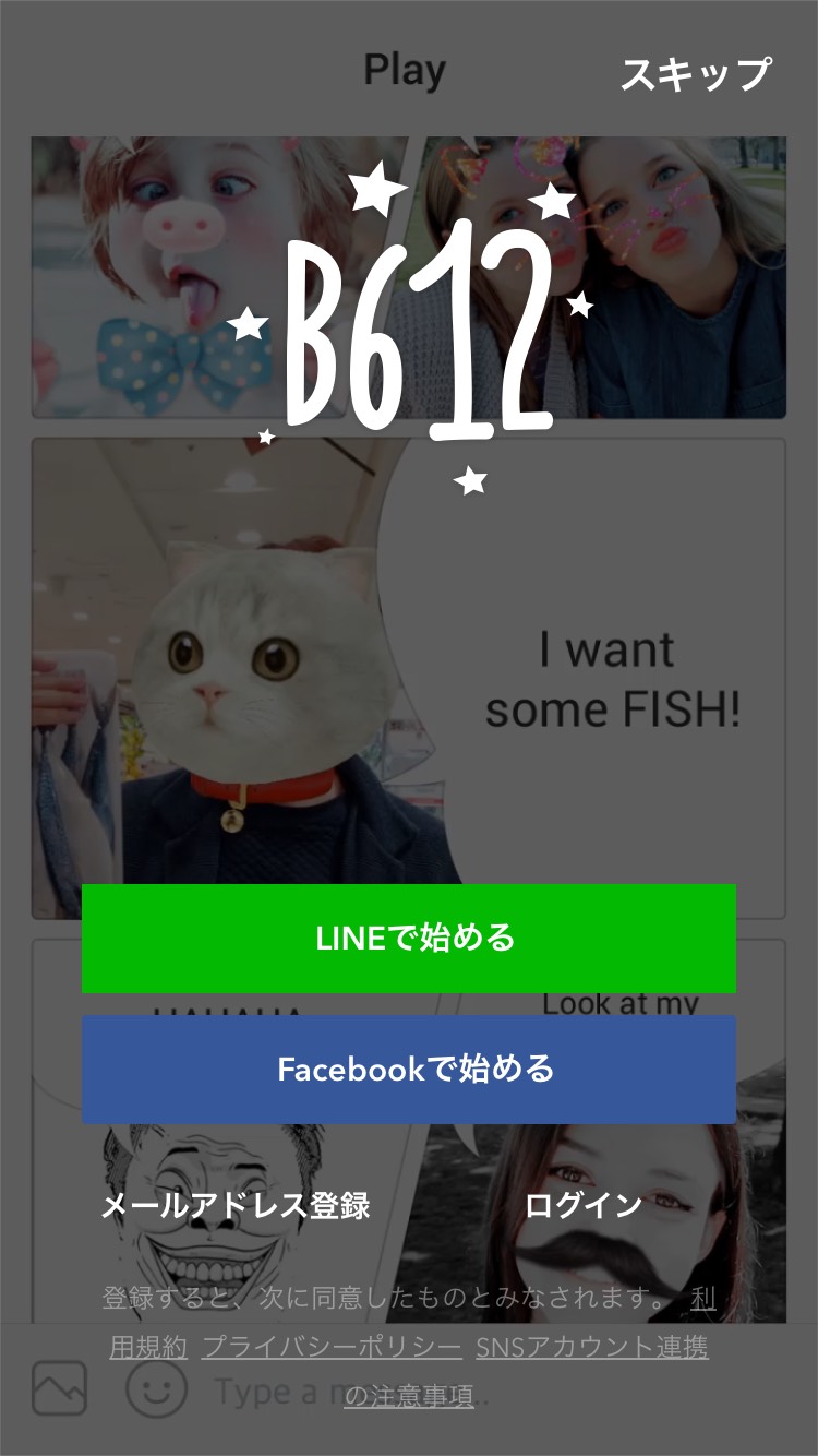 B612を起動するときに出てくるログイン画面、または写真撮影画面からシャッター下の「Play」ボタンをタップして、[LINEで始める]からログインをしてください。