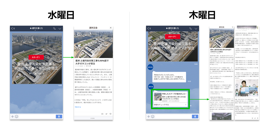 また「週刊文春」では、スクープをどこよりも早くプッシュで届ける有料記事システムを導入!2017年1月より誌面発売前日に"短文スクープ"を配信し、LINEコインを利用して予約購入した人は発売日当日朝にスクープ詳細記事を受け取ることが可能となります。
