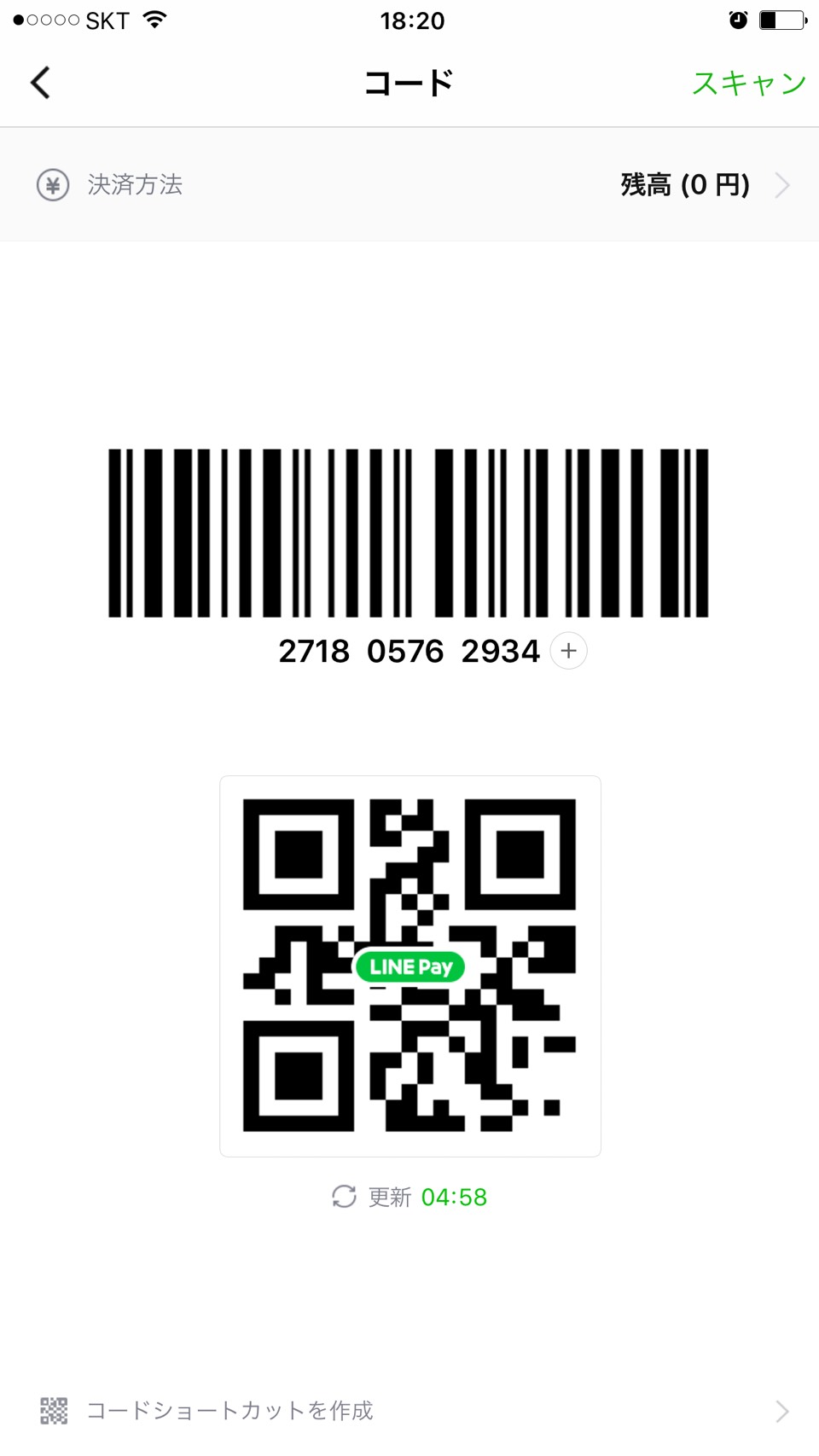LINE Payメイン画面の「設定」から「コードショートカットを作成」という項目をタップ。