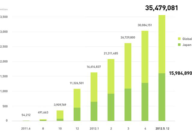 5/12(土)、サービス開始から約11ヶ月でLINEの登録ユーザー数(iPhone/Androidアプリ・フィーチャーフォン総計)が3,500万人を突破しました!また、日本国内のユーザー数は約1,600万人となりました!