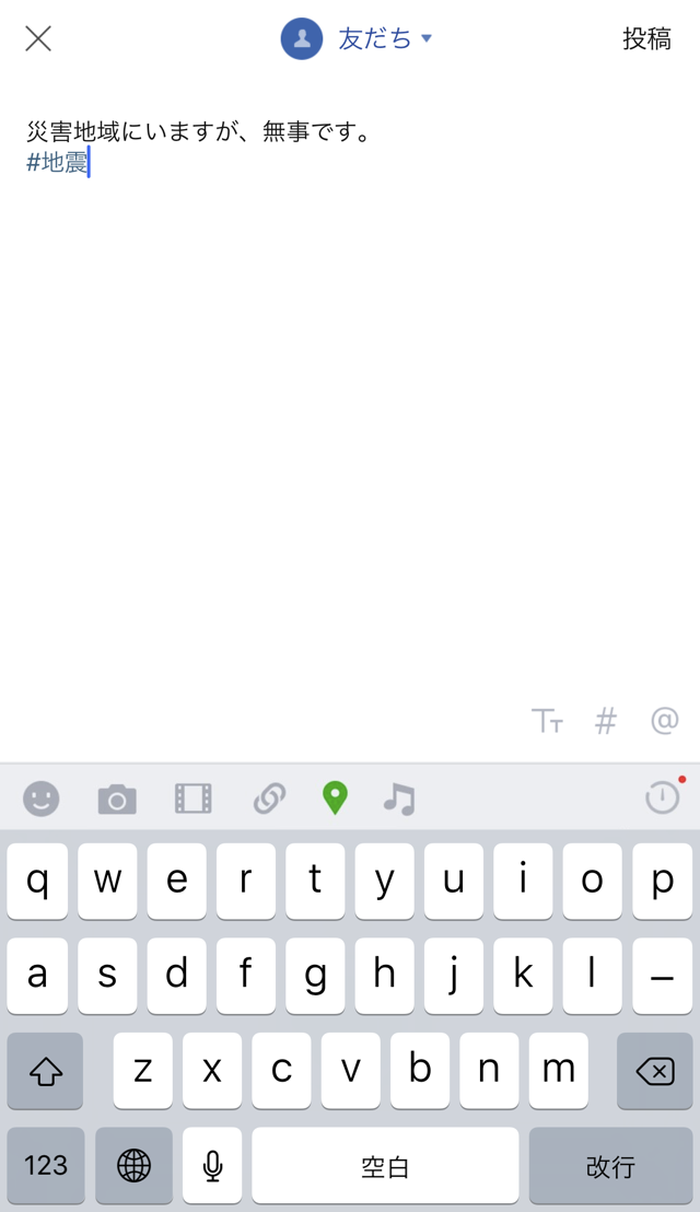 3.LINEのタイムライン上で自分のLINE友だち全員に無事や被害状況を知らせることができます
