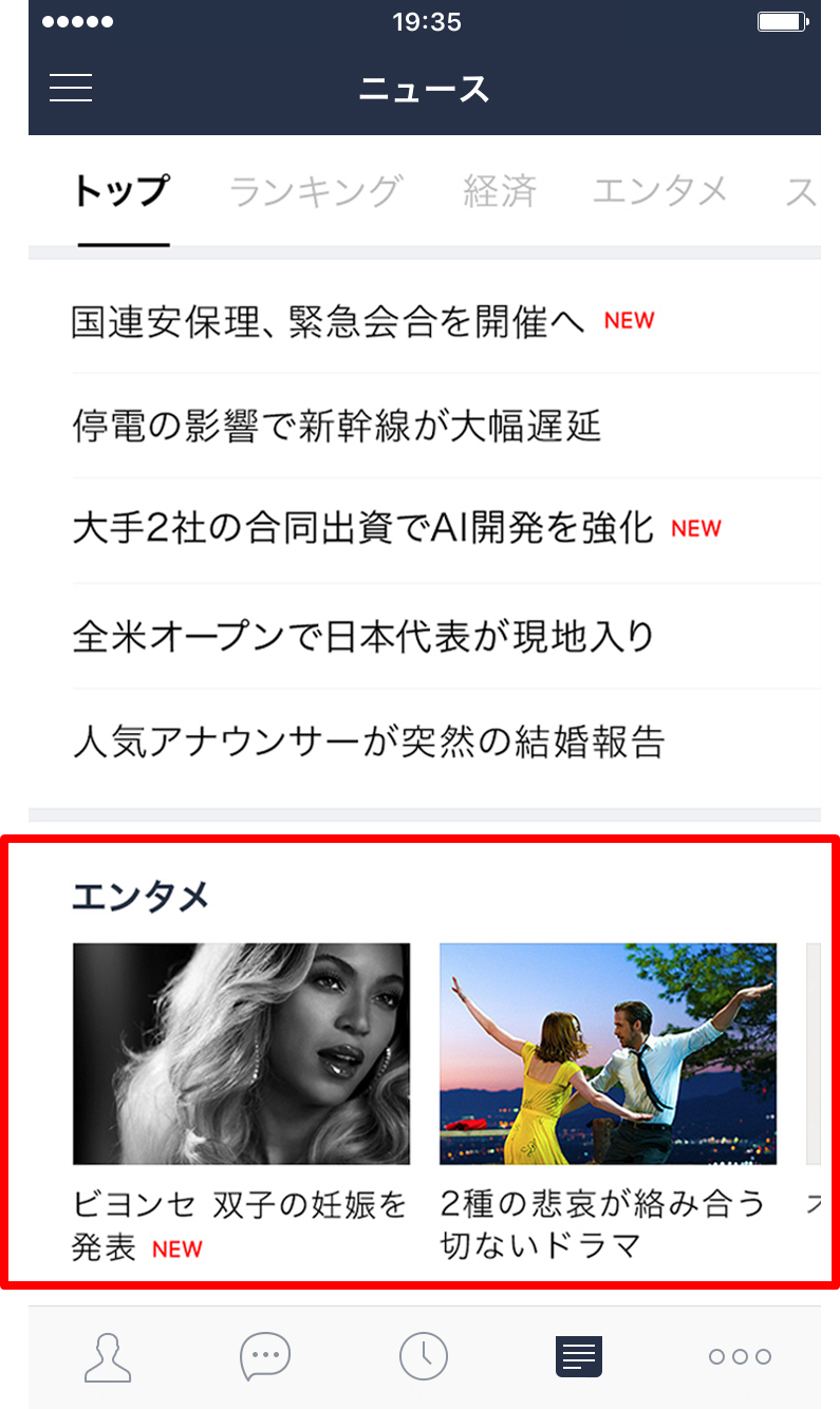 本日より、Android/iOS版LINEのメインメニューに「ニュース」のタブを追加。