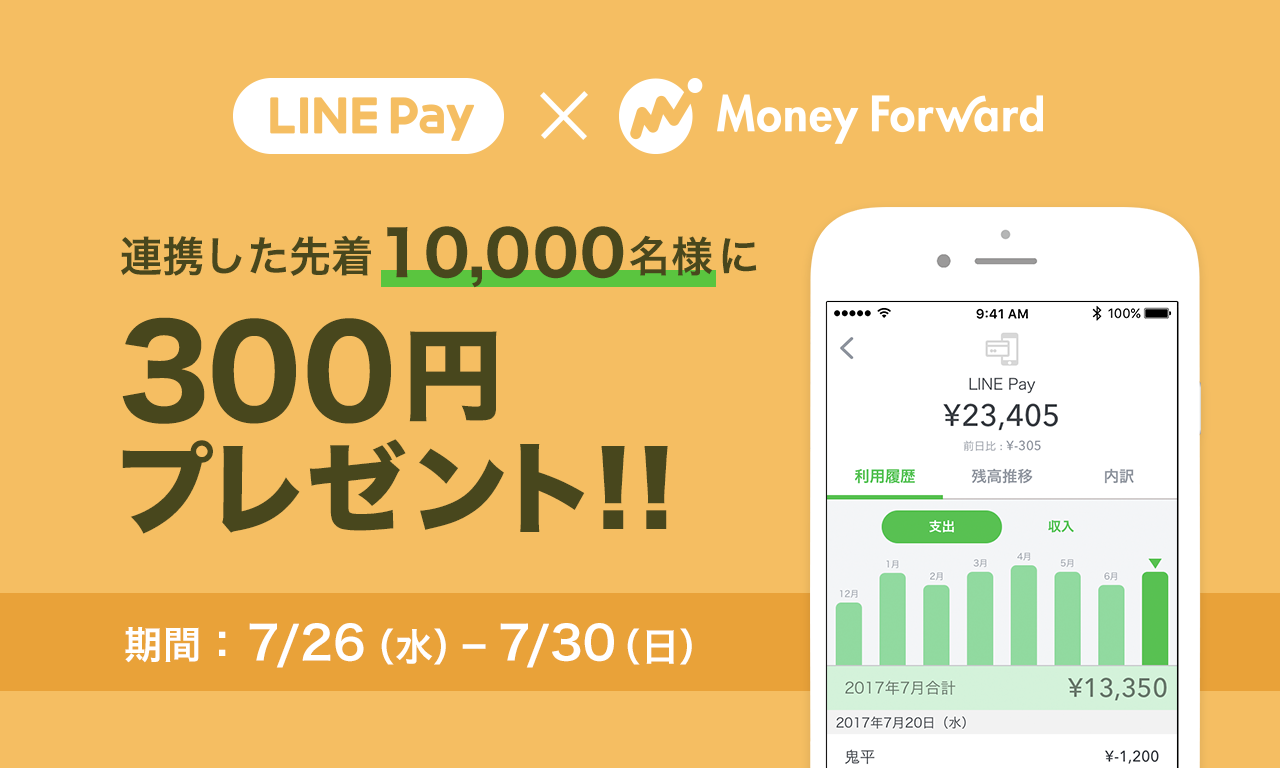 以前からご要望をいただくことが多かった「マネーフォワード」と「LINE Pay」の連携がスタートしました!記念して、連携をした方先着10,000名様に300円分のLINE Pay残高をプレゼントするキャンペーンを開催します。