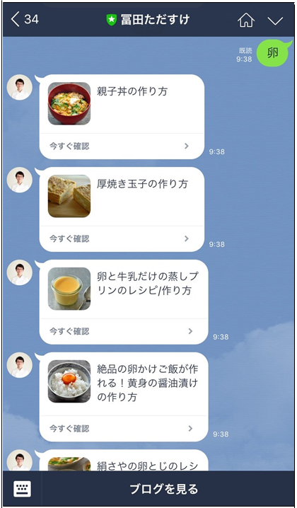 食材や料理の名前を送信すると、冨田さんのwebサイトに載っているレシピの中から、メニューをピックアップしてくれます。