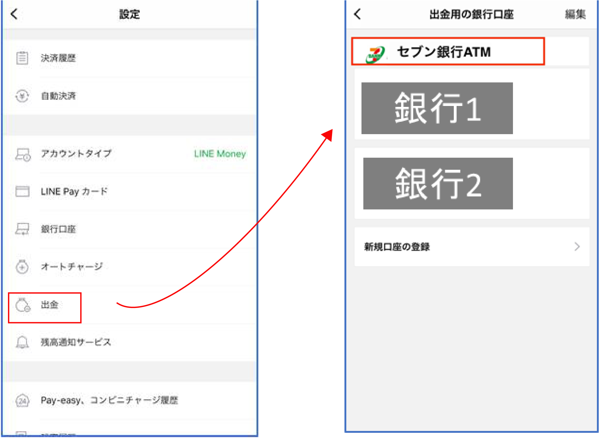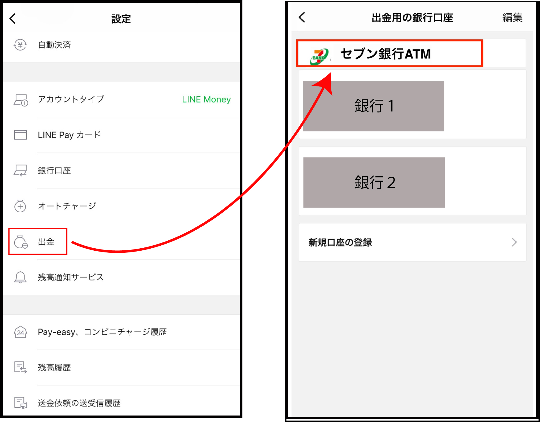 2)スマホ画面で、設定から[出金]をタップすると、出金用の銀行口座が表示されるので、[セブン銀行ATM]をタップ。