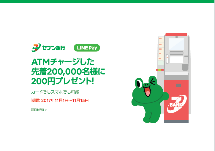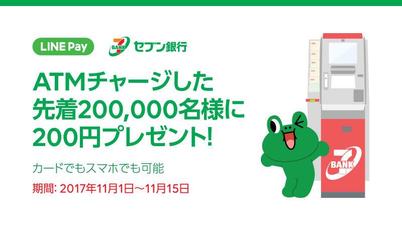■概要:期間中、セブン銀行ATMでLINE Payにチャージした先着20万名さまに200円分のLINE Pay残高をプレゼント