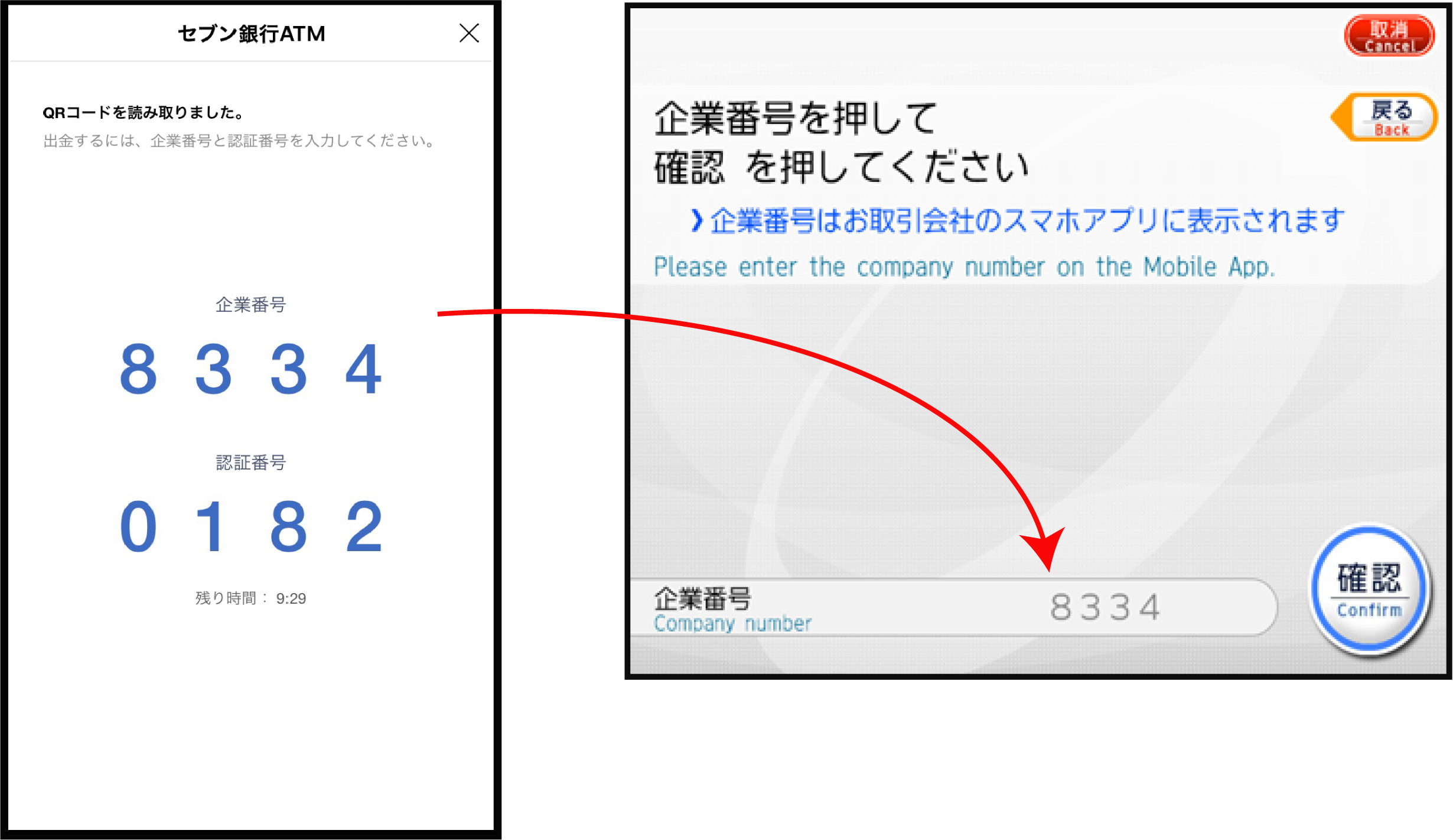 まず、企業番号をATMに入力し、[確認]をタップします。