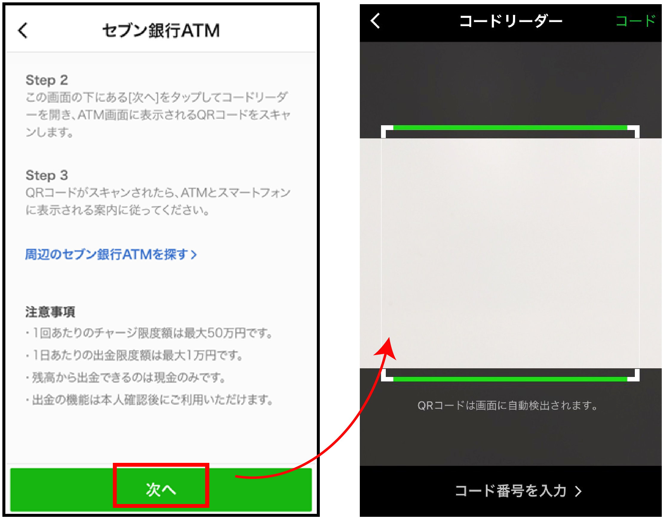 セブン-イレブン店舗内を中心に設置されている、全国23,000台以上のセブン銀行ATMで、24時間スマホ(コード)(※1)・LINE Pay カードのどちらかを使って、現金の入金(チャージ)および出金(※2)がご利用いただけます。