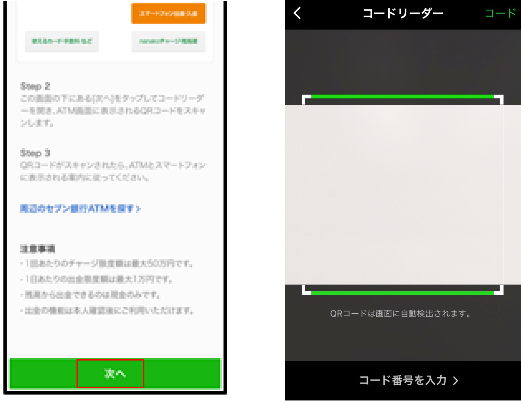 セブン銀行ATMは[スマートフォン 出金・入金]をタップしてください。※[チャージ]ボタンからのチャージは順次利用開始となります。