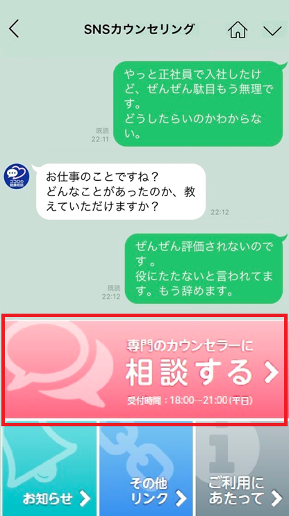 2.トーク画面下のメニューにある「専門のカウンセラーに相談する」をタップしてください。