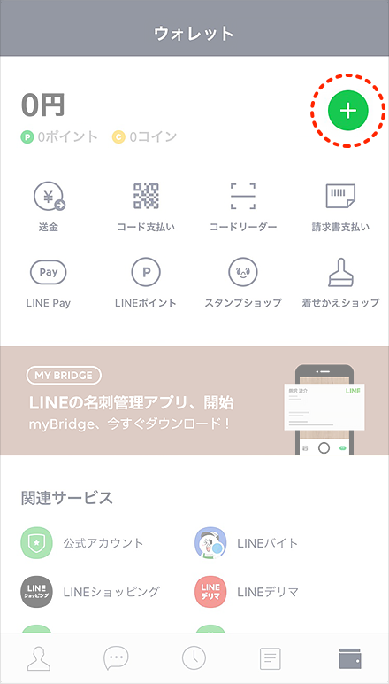 LINEを立ち上げ、右下の「ウォレット」タブから、「+」ボタンをタップします。