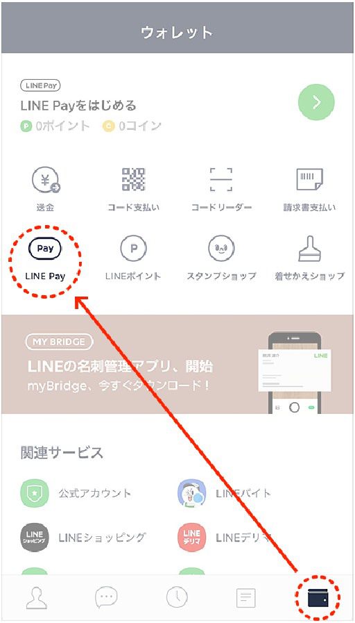 LINEを立ち上げ、右下の「ウォレット」タブから、「LINE Pay」をタップします。