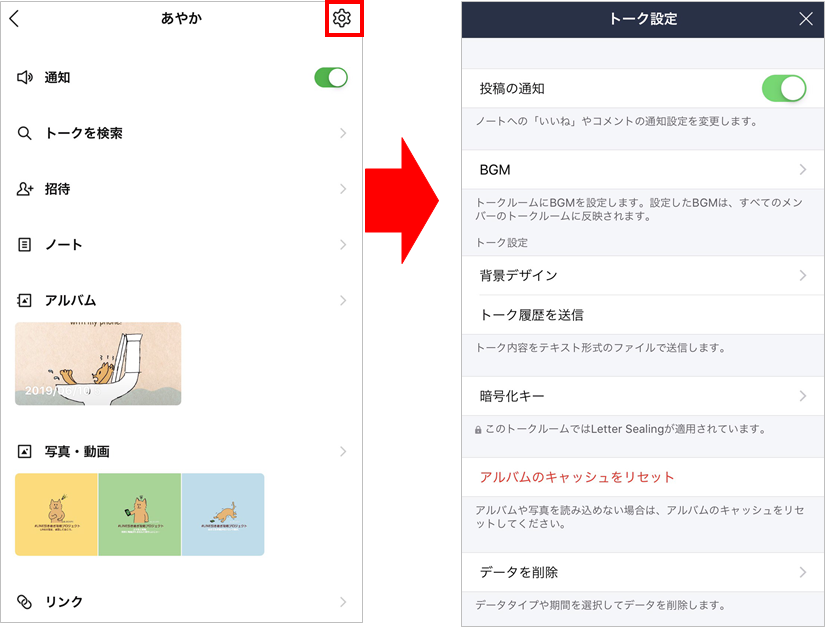 トークルームの背景デザインを変更したり、トーク履歴をファイルで送信するなどの細かい設定や機能は、歯車のマークより選択できます。